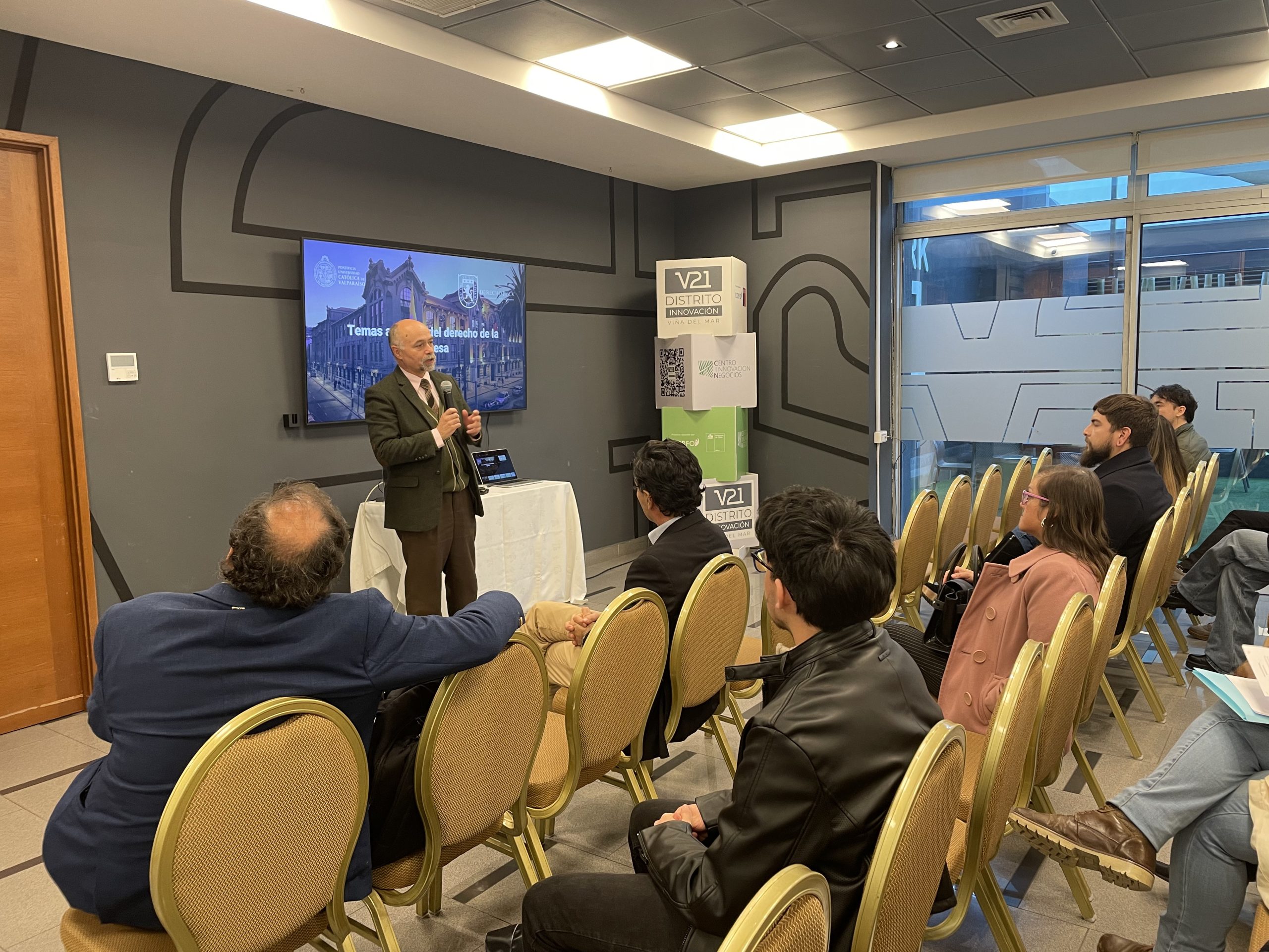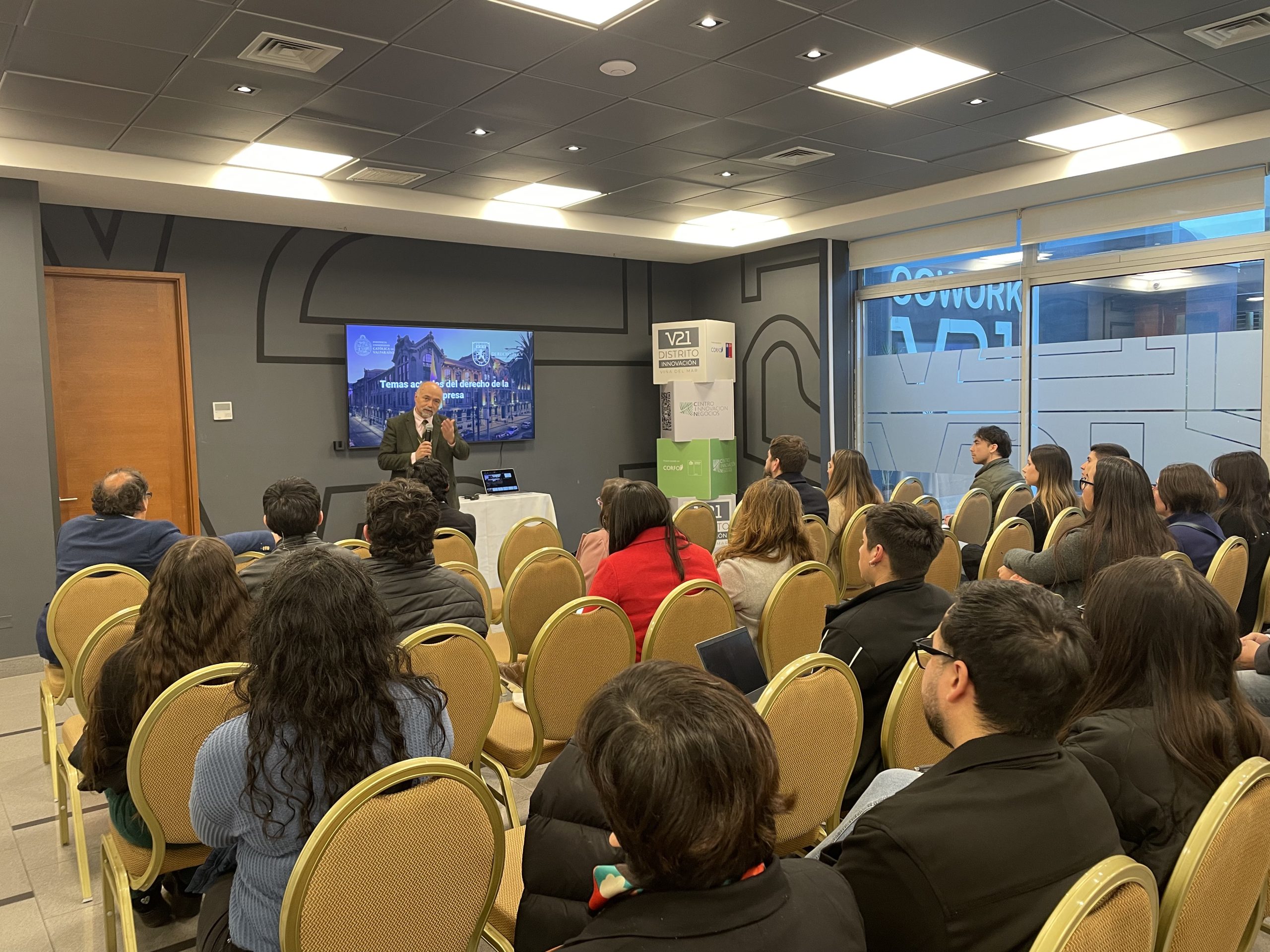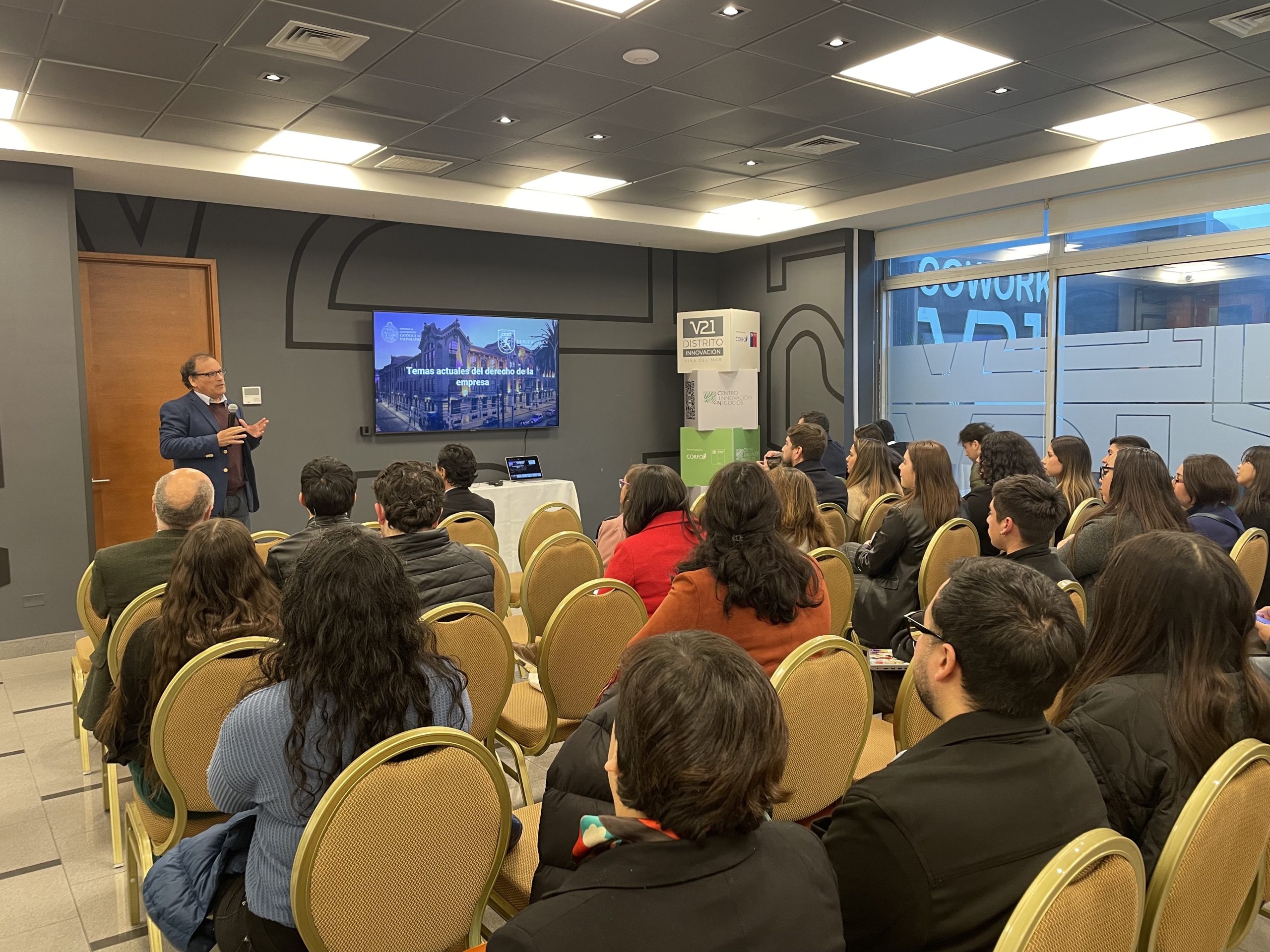 Con una gran convocatoria se dio inicio al ciclo de charlas “Temas Actuales del Derecho de la Empresa”, organizado en conjunto por el Departamento de Derecho de la Empresa de la Escuela de Derecho de la PUCV, el Centro de Innovación y Negocios y el Distrito de Innovación V21.