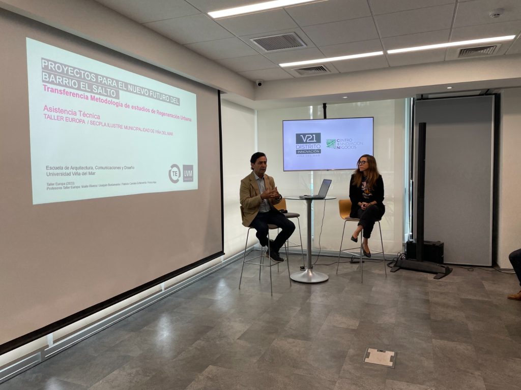 Específicamente el Taller Europa 2023 realizó un recorrido de investigación por las ciudades de Barcelona, Bilbao y Viña del Mar, conectando con las necesidades de la Ciudad Jardín y, particularmente, con los desafíos de recuperación del Barrio El Salto, el cual comprende dentro de su infraestructura al Distrito de Innovación V21.