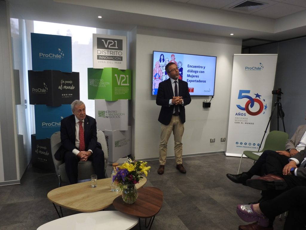 El Distrito de Innovación V21 fue el punto de encuentro para que el ministro de Relaciones Exteriores, Alberto van Klaveren, y el director general de ProChile, Ignacio Fernández, presentaran las novedades sobre comercio exterior inclusivo y con perspectiva de potenciamiento a mujeres emprendedoras, en el marco del conversatorio “Empresas exportadoras lideradas por mujeres de la región de Valparaíso”.